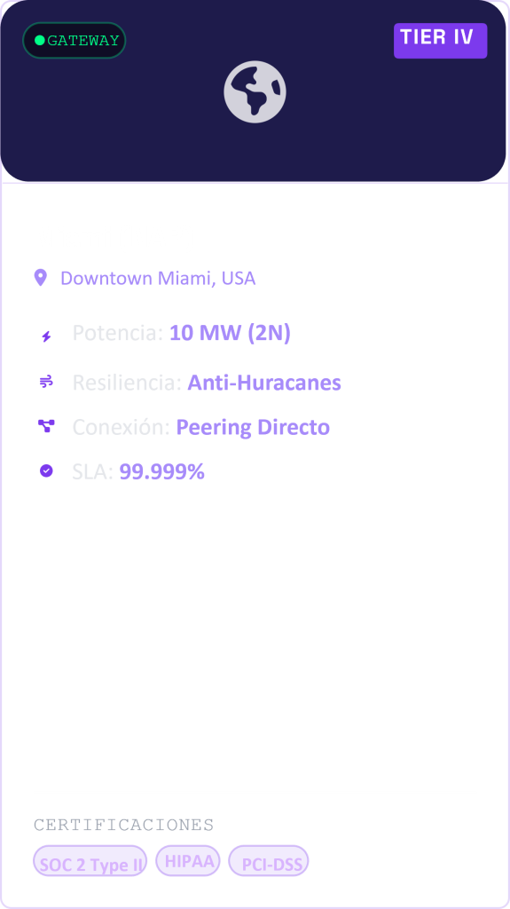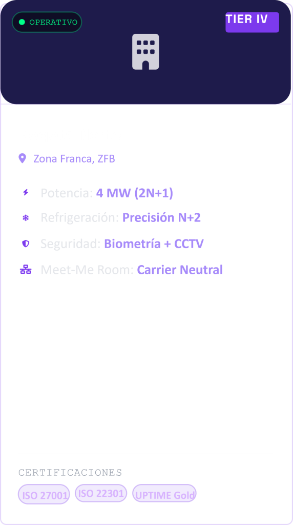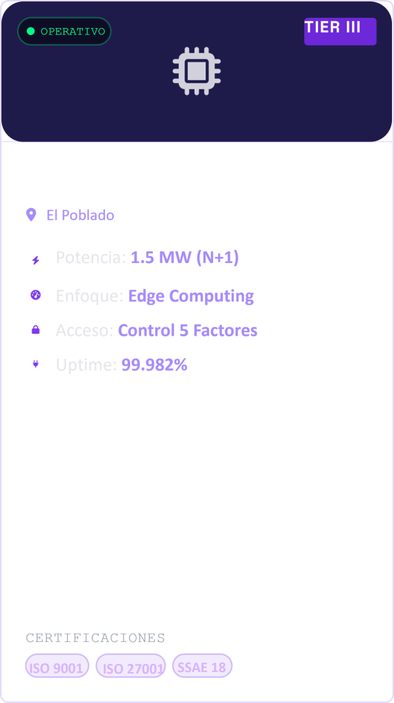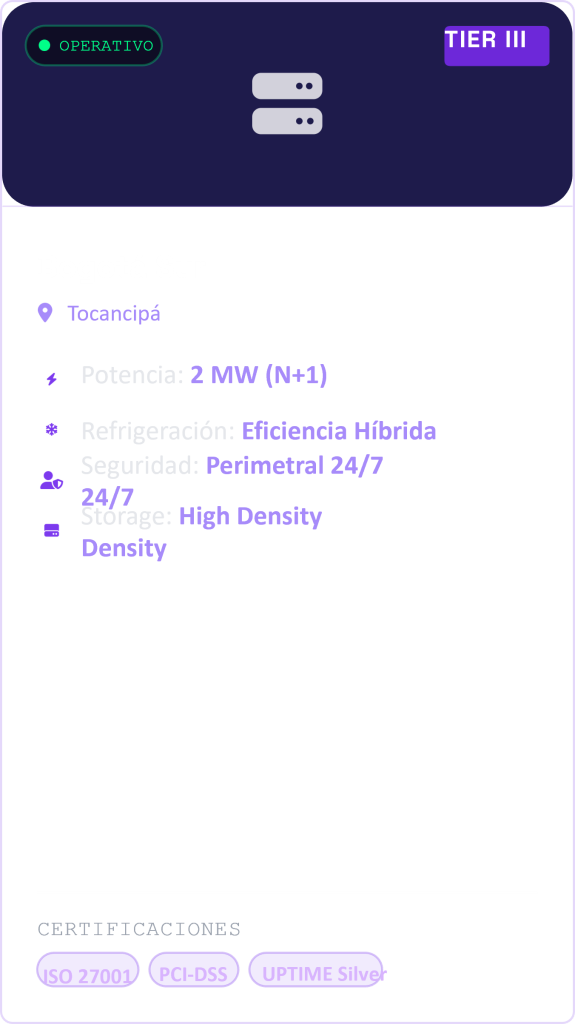 Centros de datos de clase mundial diseñados para la máxima disponibilidad. Infraestructura resiliente, segura y conectada estratégicamente para garantizar la continuidad de su negocio.